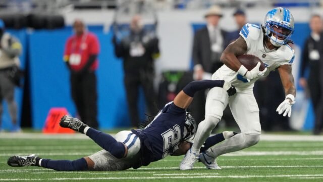 DETROIT – Jahmyr Gibbs e uma defesa que de repente gerou pressão e reviravoltas ajudaram o Detroit Lions a permanecer na disputa por uma vaga nos playoffs.