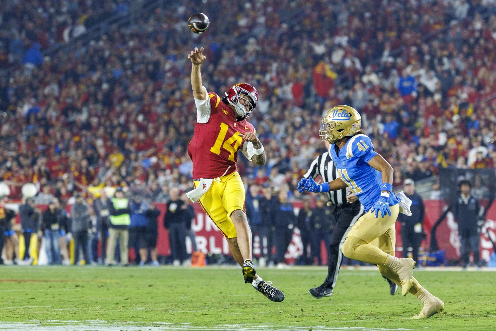 Iamaleava, que foi questionado depois de sofrer espasmos no pescoço na semana passada, foi igualmente perspicaz, completando 27 de 38 para 200 jardas e um landing. Mas o ataque da UCLA passou a maior parte do jogo mergulhando e afundando no campo, com a intenção de manter a bola fora das mãos do USC. Os defensores do Bruin, Jalen Berger e Anthony Woods, combinaram 17 toques e 112 jardas, já que ambos foram essenciais para ajudar a movimentar a bola.
