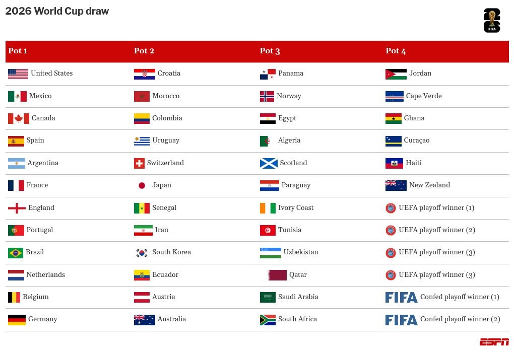 Os anfitriões – Estados Unidos, Canadá e México – serão colocados no Pote 1, como sempre, e já foram distribuídos em grupos específicos. Os nove primeiros países juntar-se-ão aos três anfitriões no Pote 1, com os próximos 12 no Pote 2, e assim sucessivamente.
