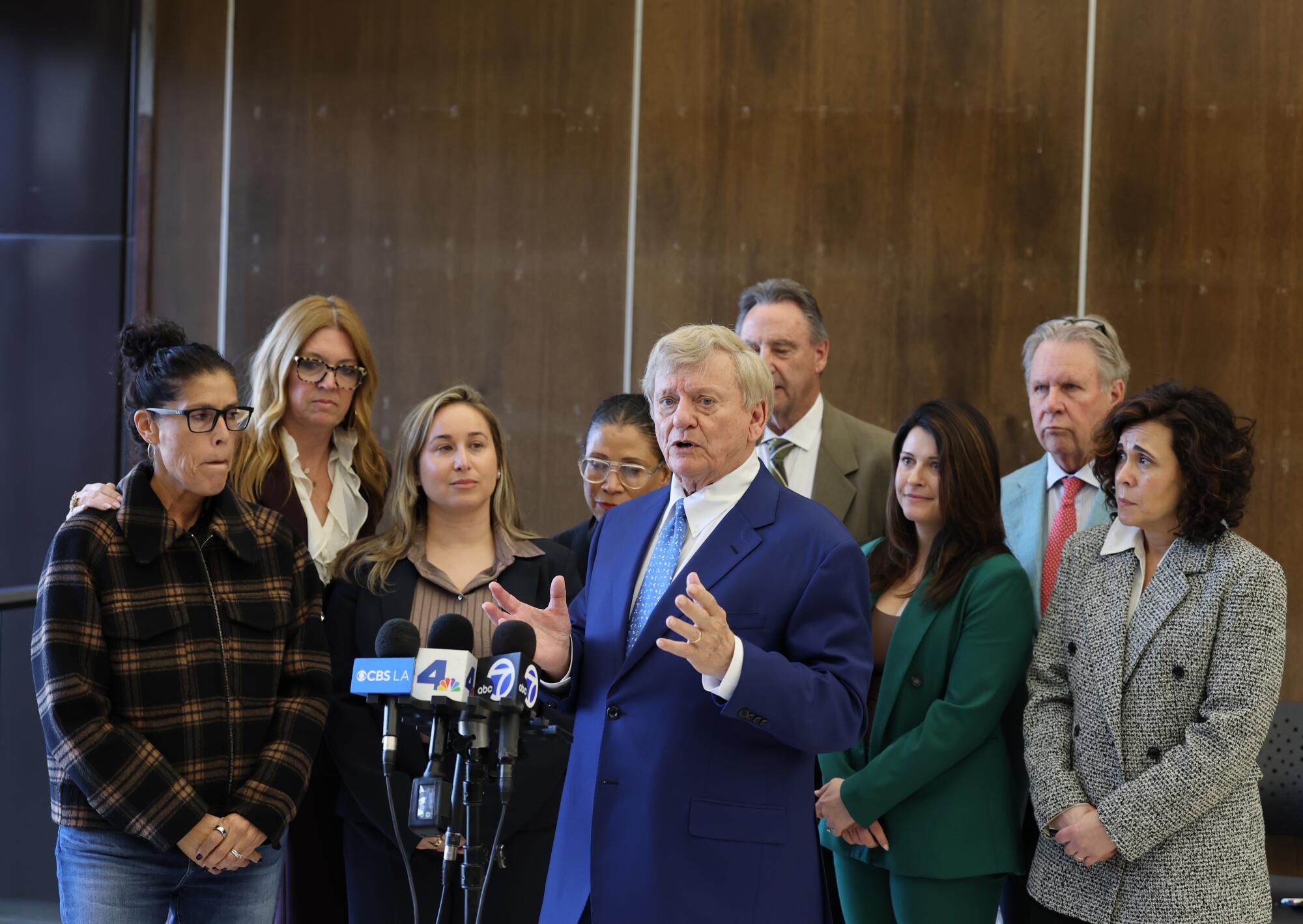 O advogado Rusty Hardin, centro, dirige-se à mídia depois que um acordo foi alcançado no processo de homicídio culposo movido pela família do arremessador Tyler Skaggs contra o Los Angeles Angels no Tribunal Superior do Condado de Orange, em Santa Ana, na sexta-feira.