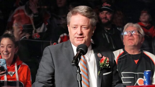 Tim Saunders organiza uma cerimônia antes do jogo em homenagem a Steve Coates, uma carreira de 43 anos como membro da equipe de transmissão do Philadelphia Flyers, no Wells Fargo Heart na Filadélfia, Pensilvânia, em 1º de abril de 2023. (Len Redkoles/NHLI through Getty Pictures)