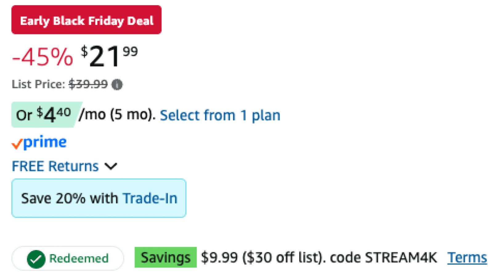 ECONOMIZE $ 30: A partir de 17 de novembro, o Amazon Fire TV Stick 4K Select custa apenas US$ 9,99 para clientes selecionados com o código de cupom na página STREAM4K na Amazon. Isso representa 75% de desconto no preço de tabela e o preço mais baixo de todos os tempos.