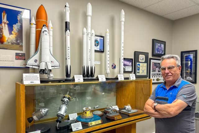 De volta ao seu museu, Proach guia os visitantes até um módulo lunar detalhado da Apollo 11 assinado por Buzz Aldrin, um modelo que ele construiu pela primeira vez há mais de 50 anos, quando era estudante do ensino médio.