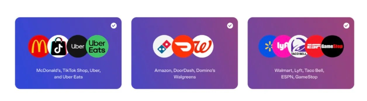 No entanto, em vez de oferecer uma certa porcentagem de volta por categoria de gastos, como mantimentos, gasolina ou jantares, o programa da Venmo faz com que os clientes escolham pacotes selecionados de suas marcas favoritas. Por exemplo, você pode escolher um grupo de marcas que inclua McDonald’s, TikTok Shop, Uber e Uber Eats, ou um que ofereça Amazon, DoorDash, Domino’s e Walgreens.